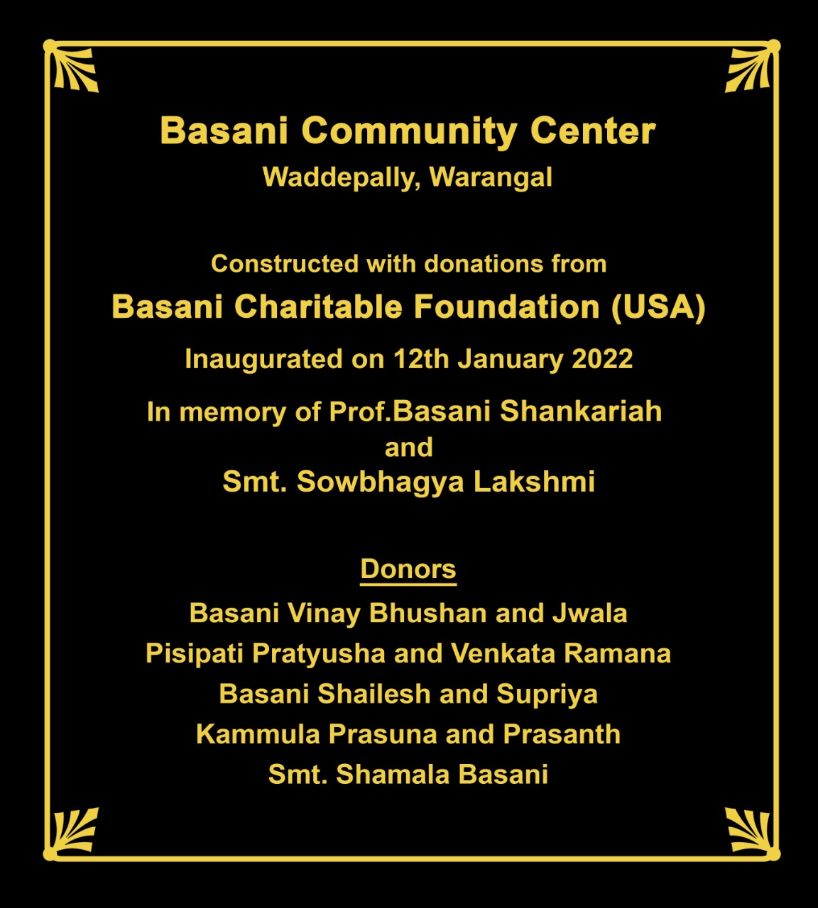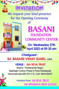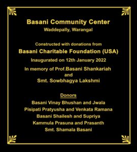 | Basani Foundation Community Center | Sai Seva Trust Yoga/Meditation Hall, Basti Dawakhana | 27-Apr-2022 | Warangal, TG | INR 10,00,000 | Basani Family |