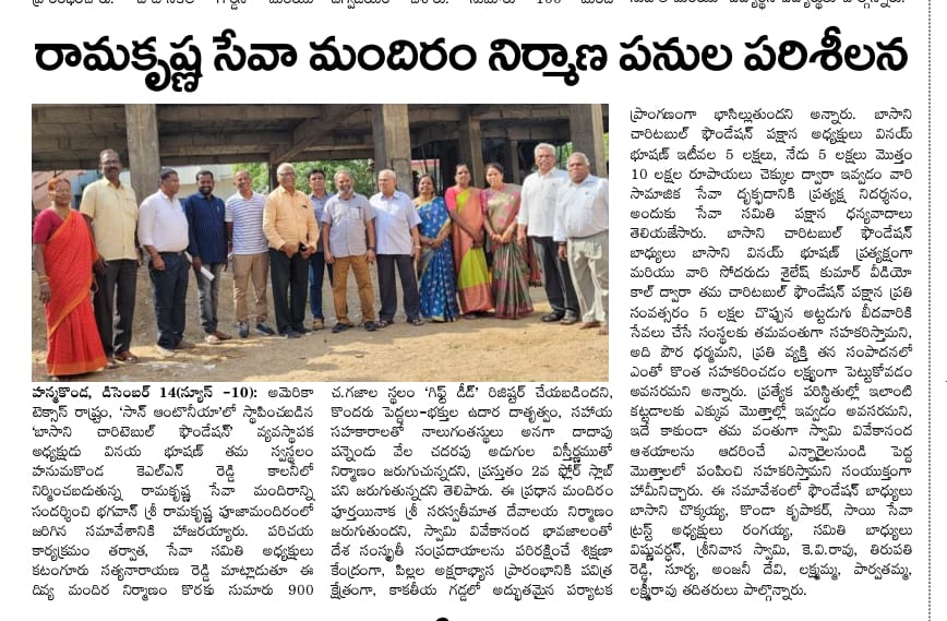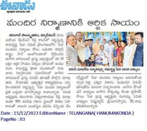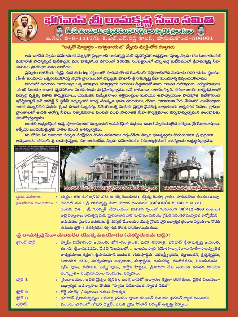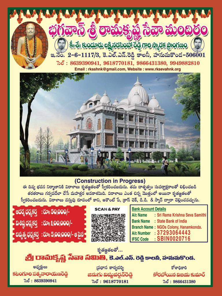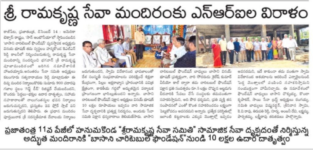 | Sri Rama Krishna Seva Mandiram | Prayer Hall | 12-Dec-2023 | Warangal, TG | INR 10,00,000 | Basani Family |