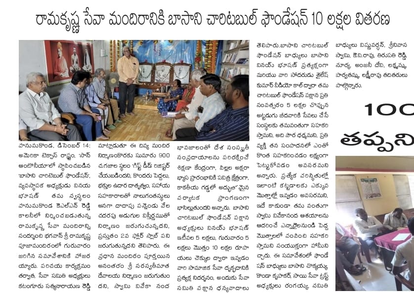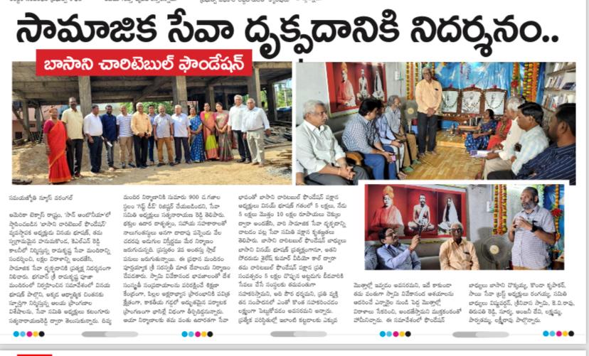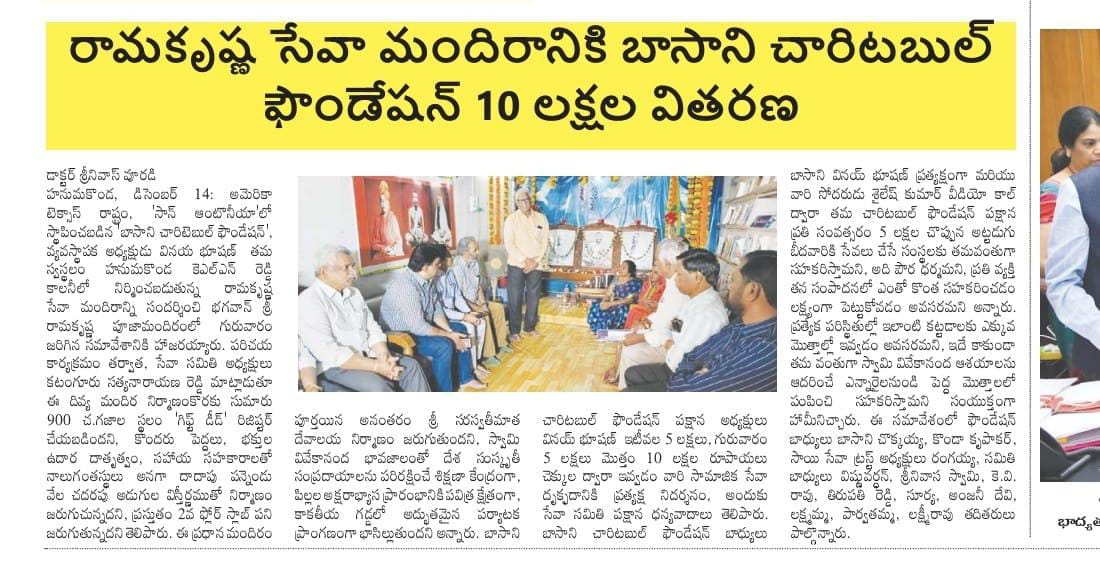 Donated ₹10 Lakhs towards the construction of RK Matt in Warangal. The “Dhyana Mandiram” will be named after Basani Foundation. Also supported regular Yoga class arrangements.
